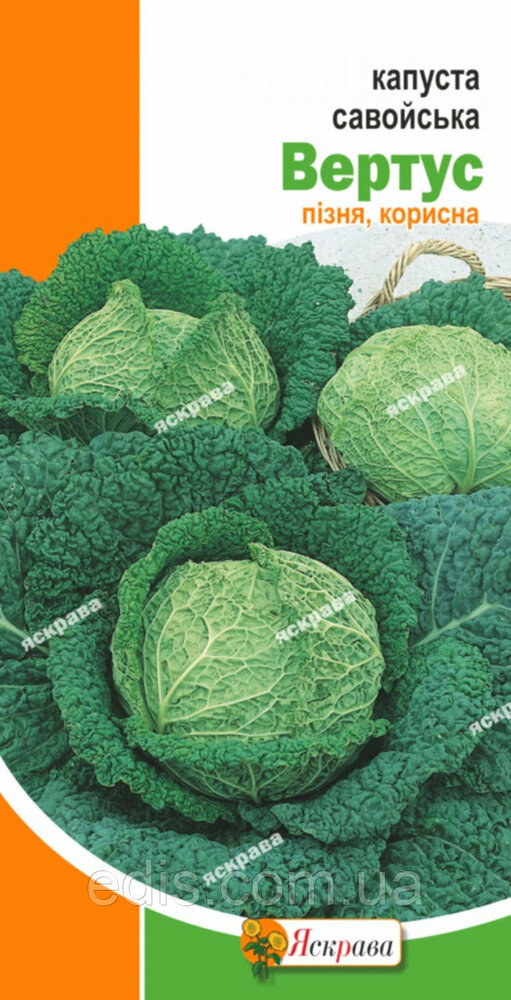Капуста савойська Вертус 0,5 г Сорт середньопізній, невибагливий. Розетка розміром 68-80 см, середня вага товарної головки - 1,5-2,8 кг з великою кількістю зовнішніх листків. Характерною особливістю яких є бульбашкова будова тканини. Дружнє дозрівання. За поживністю значно перевищує білокачанну капусту. Основне призначення - використання в свіжому вигляді для приготування різних страв. Смакові якості хороші. В холодних камерах зберігається до чотирьох місяців.