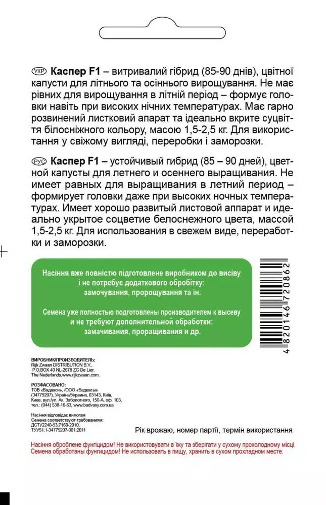 Витривалий гібрид (85-90 днів), цвітної капусти для літнього та осіннього вирощування. Не має рівних для вирощування в літній період – формує головки навіть при високих нічних температурах. Має гарно розвинений листковий апарат та ідеально вкрите суцвіття білосніжного кольору, масою 1,5-2,5 кг. Для використання у свіжому вигляді, переробки і заморозки.