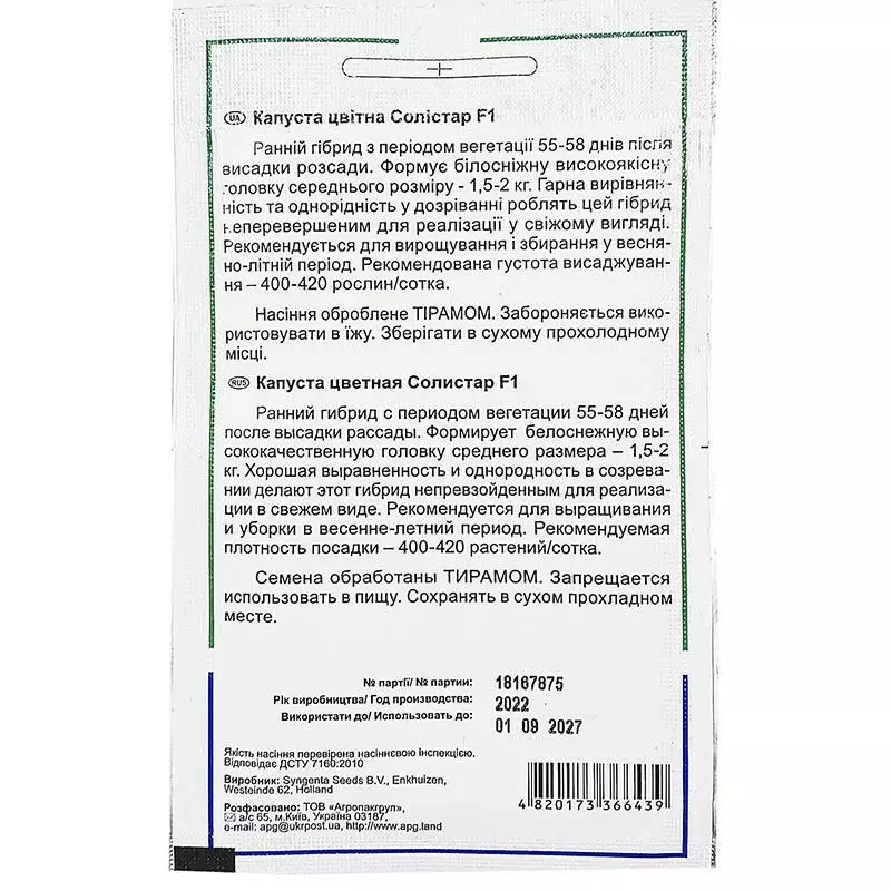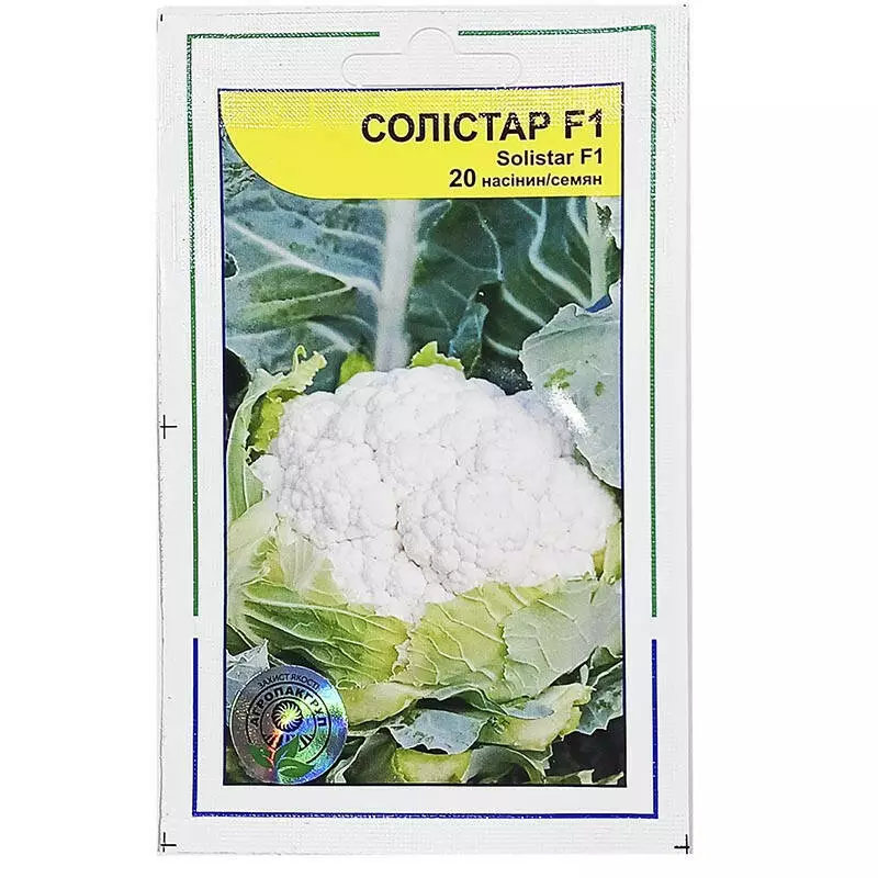 Капуста цвітна Солістар F1 – ранній гібрид, розроблений в голландській насіннєвій компанії Syngenta Seeds. Вегетаційний період 55-60 днів. Рослина формує підняту розетку середніх розмірів з сіро-зеленим листям хвилястим по краю і з помірним восковим нальотом. Головки білі, округлої форми, горбисті, частково вкриті листям, зі структурою середньої щільності і вагою 1,5-2 кг. Плоди призначені для реалізації на свіжому ринку. Врожайність 5-7 кг/м².