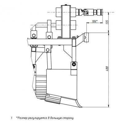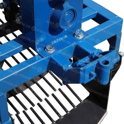 Регулировка глубины выкапывания зависит от диаметра колес, которые установлены на мотоблоке. Опорные колеса картофелекопателя используются для регулировки угла атаки. Прицепное устройство приварено.