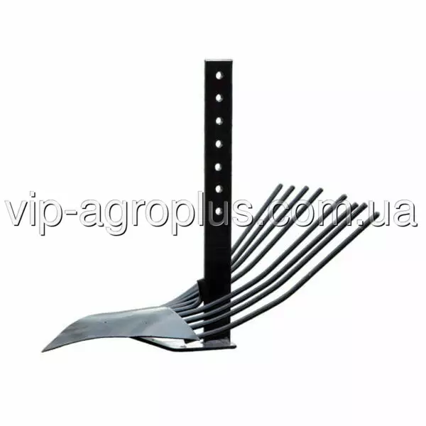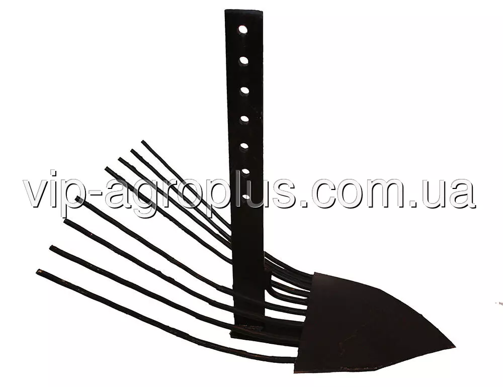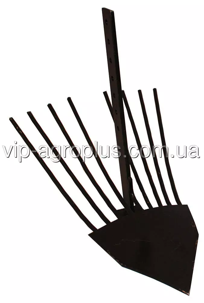 Стійка картоплекопача виготовлена ​​зі сталевої смуги 10 × 50 × 500 мм. Має 7 отворів діаметром 12,5 мм, під болт М12. Лопата картоплекопалки також виготовлена ​​зі сталі і має товщину 3 мм. Довжина від носика лопати до стійки становить 300 мм. Є підсилювач зі сталевого листа товщиною 4 мм та підошва товщиною 6 мм. У задній частині копалки встановлено вісім зубців. Вони виготовлені зі сталевого прута Ø10 мм. Загальна довжина копалки (від носика лопати до краю зубців) становить 550 мм, її максимальна ширина по крайніх точках – 350 мм.