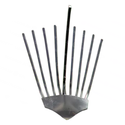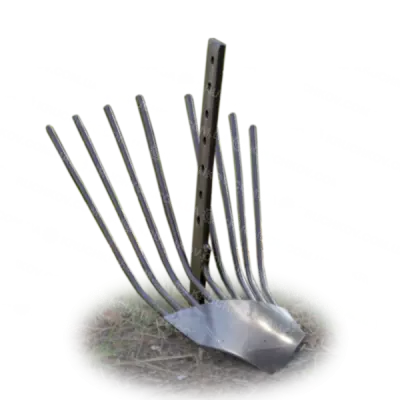 Стойка картофелекопателя изготовлена из стальной полосы 10 х 40 х 400 мм. Имеется 6 отверстий диаметром 12,5 мм, под болт М12. Лопата изготовлена из стали и имеет толщину 3 мм. Длина от носика лопаты до стойки составляет 280 мм. Есть усилитель из стального прутка Ø10 мм. Также копалка имеет подошву толщиной 6 мм. В задней части копалки имеются перья (они же зубья), их восемь. Зубья изготовлены из стального прутка Ø10 х 400 мм. Общая длина копалки (от носика лопаты до края зубьев) составляет 500 мм, максимальная ширина по крайним точкам — 350 мм.