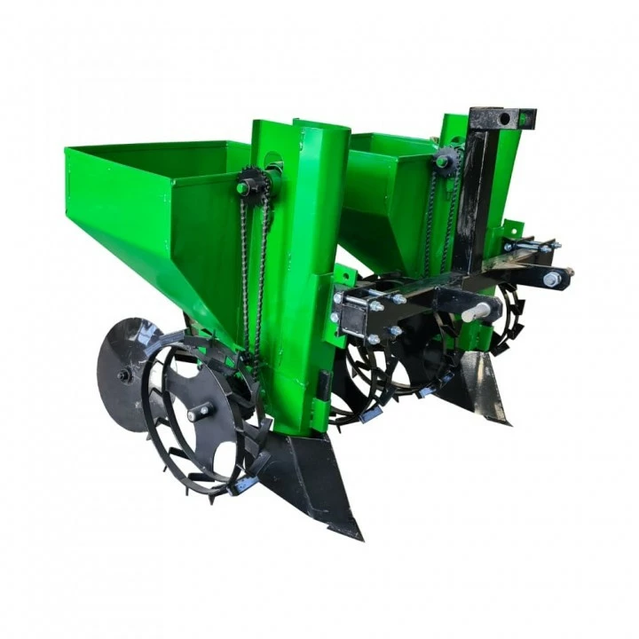 Картофелесажалка двухрядная имеет два больших бункера ёмкость которых составляет 90 литров. Двухрядная картофелесажалка имеет сцепное устройство с трёхточечным креплением. Глубина высадки картошки выставляется высотой сошника, шаг посадки картошки определяет одна из троих звезд, которые установлены на бункере с цепью и ложечкой на ней. Ниже Вы можете увидеть схожие модели и сравнить их с любой сажалкой, а наши менеджеры помогут Вам с любым возникшим вопросом. Крепится картофелесажалка к минитрактору с помощью навесного оборудования.