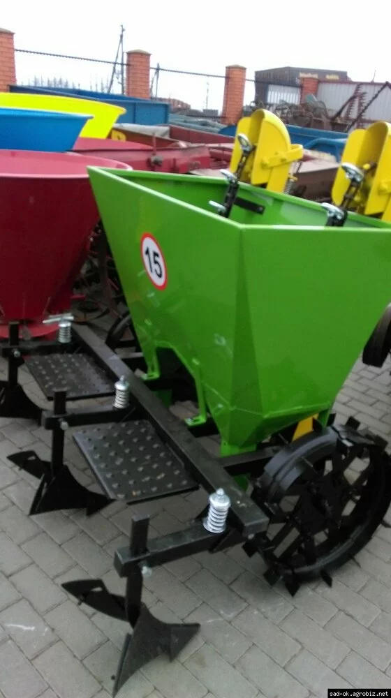 Двухрядная навесная сажалка для картофеля присоединяется к трактору при помощи заднего навесного устройства (ЗНУ). Сажалка взаимодействует с тракторами оснащёнными ЗНУ второй категории. Она выполняет все операции в одном рабочем цикле, связанным с высаживанием картофелей т.е. вспахивает борозды, автоматически высаживает картофель и окучивает землю, формируя гряды.