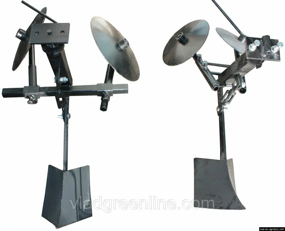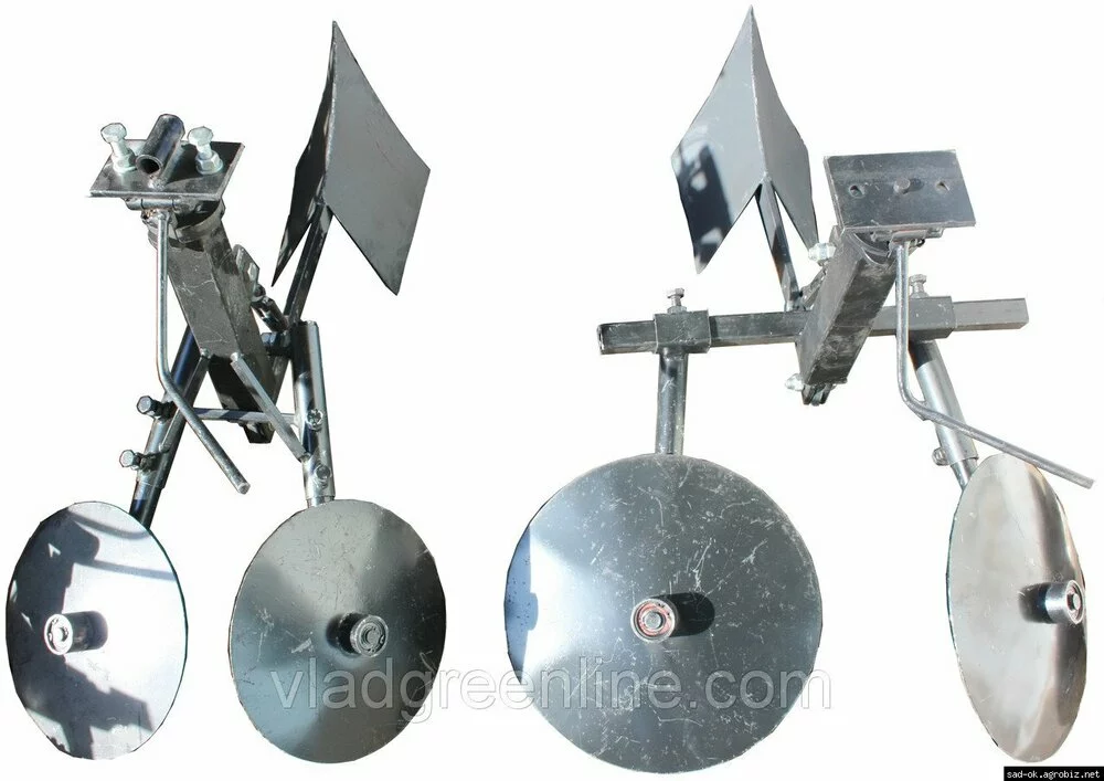 Комплект для посадки картофеля. Включает в себя сошник для нарезания борозды, диски для закапывания картофеля (окучник), поворотный механизм, механизм талреп (для регулировки глубины борозды).