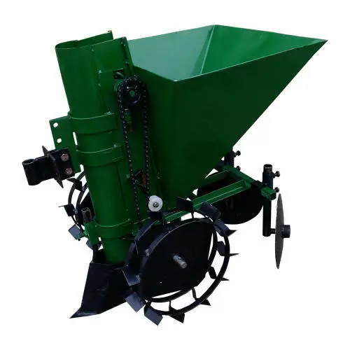 Картоплесаджалка мотоблочна П-1Ц — це надійне і ефективне пристосування для посадки картоплі в один ряд, розроблене для полегшення сільськогосподарських робіт на невеликих та середніх ділянках. Завдяки простій конструкції, цей агрегат легко агрегатується з будь-якими мотоблоками і мототракторами, які мають відповідний тип навісного обладнання. Привод механізму подачі картоплі здійснюється через ланцюг від ґрунтозацепів, що забезпечує точність і надійність укладки бульб.