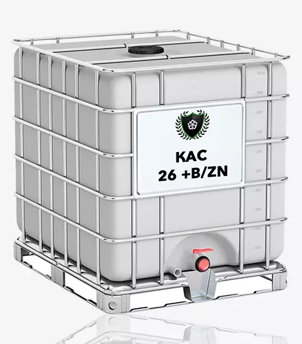 Назва товару: КАС 26 +b/zn Опис: КАС 26 +b/zn — це рідке азотне добриво, що являє собою суміш карбаміду та аміачної селітри у водному розчині. Містить азот в амідній, амонійній та нітратній формах, що забезпечує повільне вивільнення азоту. Завдяки цьому добриво ефективно живить рослини протягом тривалого часу. Механізм дії: КАС 26 +b/zn містить азот у трьох хімічних формах: амідній (карбамід), амонійній та нітратній (аміачна селітра). Амідний азот поступово гідролізується до амонійного, який потім нітрифікується до нітратного. Завдяки цим перетворенням азот поступово надходить у доступну для рослин форму, що забезпечує тривале живлення протягом усього періоду вегетації. Азот стимулює ріст надземної частини, покращує фoтoсинтез, сприяє утворенню білків, вуглеводів, хлорофілу. Переваги: - Містить азот в оптимальних для рослин формах. - Забезпечує тривале азотне живлення. - Легко засвоюється через кореневу систему і листя. - Сумісний з більшістю пестицидів та мікродобрив. - Технологічний у застосуванні, вноситься будь-яким обладнанням. - Економічно ефективніший за тверді азотні добрива. Особливості застосування: - Вноситься як основне добриво восени та навесні під основний обробіток ґрунту. - Використовується для позакореневого та кореневого підживлення по вегетації. - Ефективний для внесення в стресових умовах, коли уповільнене кореневе живлення. - Можна поєднувати з пестицидами та мікродобривами для листових підживлень. - Норми внесення залежать від культури, фази розвитку, типу ґрунту. - Дозволяє коригувати живлення рослин для отримання бажаних показників.