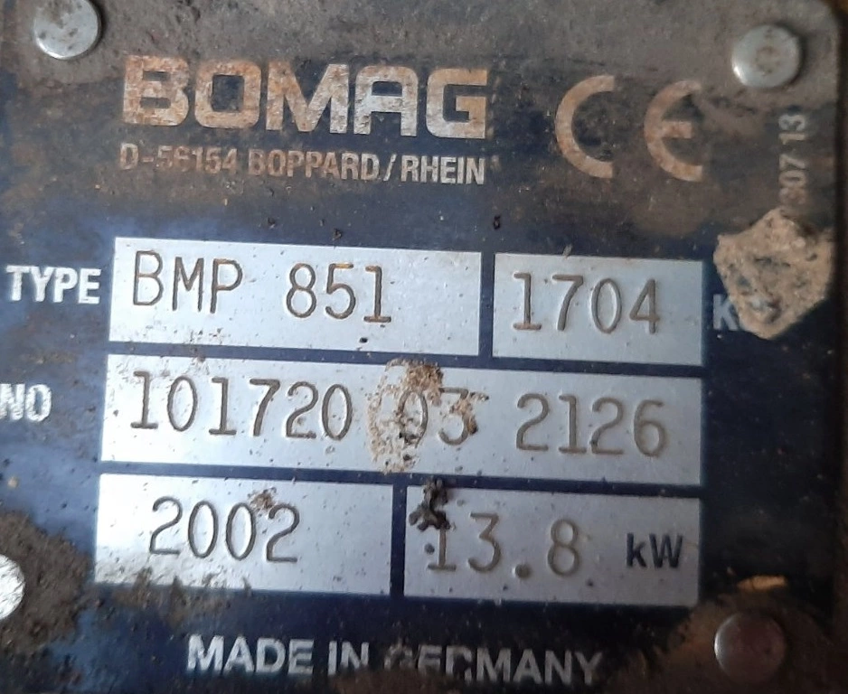 ГРУНТОВИЙ КАТОК BOMAG BMP 851, Рабоча ширина 850 мм. Дистаційний - на пульту, ПРОДУКТИВНІСТЬ УЩІЛЬНЕННЯ ГРУНТУ: Гравій, пісок 52-82 м3 / год Ґрунтова суміш 52-82 м3 / год М'який грунт, глина 30-40 м3 / Швидкість руху вперед, 1, 2км / год Швидкість заднього ходу, 2, 7км / год. Власна маса 1,75т. Ціна з ПДВ