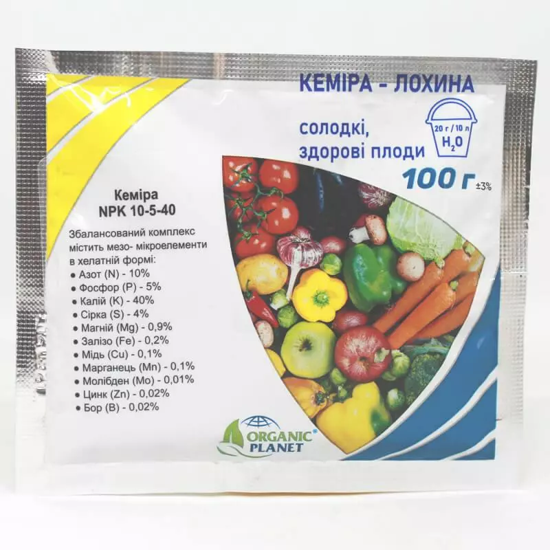 Кеміра – Лохина (солодкі та здорові плоди) з підкислюючим ефектом – добриво з високим вмістом калію. Значно підвищує життєздатність рослини, покращує дозрівання. Покращуються якісні показники продукції (вміст цукру, колір, міцність, лежкість), запобігає опаданню плодів (фруктів, насіння), збільшує їх розмір. Покращує стійкість багаторічних садових рослин до несприятливих умов зими. Хелатне мінеральне добриво для позакореневого підживлення Кеміра NPK 10-5-40 вноситься в передзбиральний період.