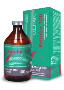 Кетофур 100 (розчин для ін'єкцій) Опис Масляниста суспензія від жовтого до коричнево-жовтого кольору, з легким запахом складових, при зберіганні розшаровується. Склад 1 мл препарату містить діючі речовини: цефтіофуру гідрохлорид - 50,0 мг; кетопрофен - 50,0 мг. Фармакологічні властивості ATC vet класифікаційний код QJ01- антибактеріальні ветеринарні препарати для системного застосування. QJ0DD99 - цефтіофур, комбінації. Цефтіофур відноситься до групи цефалоспоринів третього покоління. Він активний проти грам позитивних та грам негативних бактерій, включаючи штами, які продукують бета-лактамази, і деякі анаеробні бактерії: Escherichia coli, Pasteurella haemolytica, Pasteurella multocida, Haemophilus somnus, Actinobacillus pleuropneumoniae, Haemophilus parasuis, Salmonella cholerasuis, Streptococcus suis, Streptococcus zooepidemicus, Pasteurella spp , Staphylococcus spp., Actynomyces pyogenes, Salmonella typhimurium, Streptococcus agalactiae, S. dysgalactiae, S. bovis, Klebsiella spp., Citrobacter spp., Enterobacter spp., Bacillus spp., Proteus spp., Fusobacterium necrophorum і Porphiromonas assacharolytica (Bacteroides melaninogenicus ). Механізм дії антибіотика полягає в придушенні синтезу клітинної стінки бактерій. Кетопрофен - НПЗП на основі пропіонової кислоти. Має знеболюючу, протизапальну та жарознижувальну дію. Механізм дії пов'язаний з пригніченням синтезу простагландинів на рівні циклооксигенази. Крім того, кетопрофен інгібує ліпооксигеназу, має антибрадикінінову активність, стабілізує лізосомальні мембрани, викликає значне гальмування активності нейтрофілів. Кетопрофен є подвійним інгібітором запалення, блокуючи шляхи дії циклоксигенази і ліпоксигенази і, таким чином, не допускаючи утворення простагландинів і лейкотрієнів. Кетопрофен - болезаспокійливий засіб, який впливає на центральну і периферичну нервову систему. Його дія полягає в безпосередньому придушенні дії брадикініну, вазодилататорів та медіатора болю. Після парентерального введення цефтіофур швидко всмоктується з місця введення і проникає в усі тканини тварини. Його максимальна концентрація в плазмі крові спостерігається через годину, яка утримується на терапевтичному рівні до 24 годин, в залежності від виду тварин. Цефтіофур в організмі швидко метаболізується з утворенням десфуроілцефтіофуру, що володіє активністю, еквівалентній цефтіофуру, щодо бактерій. Цей активний метаболіт назад зв'язується з білками плазми і накопичується у вогнищі інфекції, при цьому його активність не знижується в присутності некротизованих тканин. Виведення антибіотика відбувається головним чином з сечею і з калом. Кетопрофен швидко всмоктується. Зв'язується з білками плазми. Істотні концентрації кетопрофену знайдено в синовіальній рідині, і його рівень тут вище, ніж в плазмі, а період напіввиведення в 2-3 рази вище, ніж в плазмі. Кетопрофен метаболізується в печінці до незначних біологічно активних метаболітів, а 90% виводиться з сечею у вигляді сполук глюкуроніду. Застосування Лікування свиней при захворюваннях органів дихання, викликані мікроорганізмами (Haemophilus somnus, Actinobacillus pleuropneumoniae, Salmonella cholerasuis і Streptococcus suis), чутливими до цефтіофуру, а також при комплексному лікуванні свиней синдрому ММА (метрит-мастит-агалактія), станах, викликаних гострими та хронічними формами запальних процесів опорно-рухового апарату. дозування Внутрішньом'язово один раз на добу в дозі 1 мл на 16 кг маси тіла тварини (3 мг цефтіофуру і 3 мг кетопрофену на 1 кг маси тіла тварини) протягом 3 діб. Перед застосуванням флакон з лікарськ