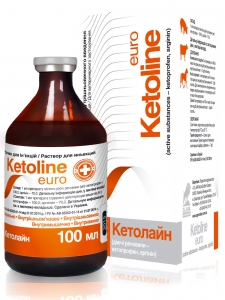 Кетолайн розчин для ін'єкцій Опис Прозорий розчин. Склад 1 мл препарату містить діючу речовину: кетопрофен 100 мг Фармакологічні властивості Нестероїдний протизапальний засіб із знеболювальною дією та жарознижуючими властивостями. Фармакодинамічна дія Кетопрофен належить до покоління нестероїдних протизапальних засобів на основі пропіонової кислоти. Агент, що викликає запалення, пошкоджує клітину і активізує фосфоліпідази, які постачають арахідонову кислоту. Це основа для ферментних систем циклоксигенази та ліпоксигенази, внаслідок дії яких утворюються речовини, що провокують запалення: простагландини, тромбоксани та лейкотрієни. Кетопрофен є подвійним інгібітором запалення, блокуючи шляхи дії циклоксигенази та ліпоксигенази і, таким чином, не допускаючи утворення простагландинів і лейкотрієнів. Крім того, кетопрофен - це болезаспокійливий засіб, який впливає на центральну та периферичну нервову систему. Його дія полягає у безпосередньому пригніченні дії брадикініну, вазодилататора та медіатора болю. Окрім дії проти брадикініну, кетопрофен проявляє активність в центральній нервовій системі, пригнічуючи біль. У коней кетопрофен нейтралізує ефект ендотоксинів і протидіє кишковим спазмам, які викликає брадикінін. Фармакокінетичні дані Кетопрофен швидко всмоктується. У корів пікові рівні в плазмі (8,025±1,9 мкг/мл) досягаються менш, ніж за годину після внутрішньом'язового введення, а біодоступність речовини майже повна. Понад 98% зв'язується з білками плазми і накопичується в запалених тканинах. Кетопрофен має високу спорідненість із синовіальними тканинами, швидко поширюється і виводиться. Тривалість дії препарату довша, ніж очікується, відповідно до його періоду напіввиведення, який триває від менш, ніж однієї години (внутрішньовенне введення у коней), до більш, ніж п'яти годин (після внутрішньом'язового введення великій рогатій худобі). Істотні концентрації кетопрофену знайдено в синовіальній рідині і його рівень тут вищий, ніж у плазмі, а період напіввиведення у 2-3 рази вищий, ніж у плазмі. Кетопрофен метаболізуєься у печінці до незначущих біологічно активних метаболітів, а 90% виводиться з сечею у вигляді сполук глюкуроніду. Застосування Велика рогата худоба - як протизапальний, болезаспокійливий та жарознижуючий засіб для лікування запальних процесів, спричинених захворюваннями органів дихання, набряком молочних залоз, гострим маститом, запальних процесів у скелетно-м'язовій системі. Коні - лікування запальних та больових станів при захворюваннях опорно-рухового апарату (кульгавість травматичного походження, артрит, артроз, травми суглобів (розтягнення зв'язок, синовіїт), переломи, тендиніт, ураження копит (пододерматит, кульгавість), запалення після хірургічних втручань); симптоматичне лікування кольок. Свині - протизапальна, аналгезуюча та жарознижуюча терапія при ММА-синдромі, лікування запальних та больових станів при захворюваннях опорно-рухового апарату; при респіраторних інфекціях. Дозування Велика рогата худоба: внутрішньовенно або внутрішньом'язово 3 мл препарату на 100 кг маси тіла (3 мг кетопрофену/кг маси тіла) один раз на добу протягом 1-3 діб. Коні: внутрішньовенно. Для лікування уражень кісток та суглобів, а також скелетно-м'язової системи вводити 1 мл препарату на 45 кг маси тіла (2,2 мг кетопроф
