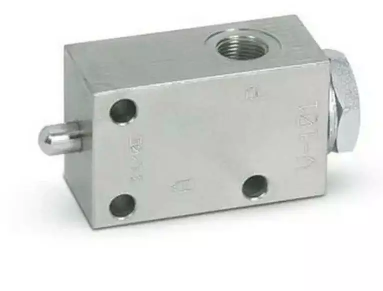 Кінцевий вимикач нормально відкритий V-101 3/8" від Oleodinamica Marchesini, що є виробником широкого спектра гідравлічних товарів за європейською якістю. Він використовується для відкриття потоку оливи в гідросистемі за допомогою механічного впливу на важільний механізм кінцевого вимикача у разі досягнення певного положення робочим органом (гідроциліндром).