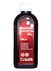 Кислота молочна 40% Склад і форма випуску Молочна кислота являє собою сиропоподібну безбарвну або злегка жовтувату рідину кислого смаку зі слабким специфічним запахом. Містить 37,5% молочної кислоти і 2,5% ангідриду молочної кислоти. Змішується в будь-яких співвідношеннях з водою, спиртом, ефіром і гліцерином. Розфасовують по 10, 50, 100, 250, 500, 1000 мл у флакони з темного скла чи поліетилену. Застосування та дозування. Застосовують всередину молочну кислоту 40% для профілактики та лікування запалення кишечника, гастритів із зниженою секреторною функцією, тимпанії у жуйних тварин, а також при метеоризмі та при гострому розширенні шлунку як засіб, що сприяє розслабленню сфінктерів, в наступних дозах на одну тварину: коням - 5-35 мл, великій рогатій худобі - 8-40 мл, вівцям - 1,5-7,5 мл, свиням - 0,5-7,5 мл, собакам - 0,2-2,5 мл, лисицям і песцям - 0,7-2,5 мл задають у водному розчині не більше 2% концентрації. При трихомонозі великої рогатої худоби піхву зрошують 1% водним розчином. При виразкових ураженнях шкіри і слизових оболонок застосовують як припікаючий засіб у вигляді 10-40% розчинів. Для підвищення несучості курей-несучок застосовують в дозі 0,5 мл 40% концентрації на 1 кг корму (500 мл на 1 тонну корму) протягом 3 місяців поспіль. Для дезінфекції повітря в інкубаторах, пташниках, телятниках та інших тваринницьких приміщеннях у присутності птиці та тварин застосовують у формі аерозолю (розпорошують 20% кислоту) в дозі 15-20 мл/м3. Протипоказання Гастрити з підвищеною секреторною функцією, мокнучі виразки, туберкульоз, гостра ниркова недостатність. Застереження Продукцію від тварин і птиці після застосування препарату можна використовувати без будь-яких обмежень. Зберігання. Сухе, темне місце в герметичній тарі при температурі не вище 20°С. Темін придатності - 1рік з дати виготовлення.