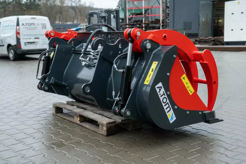 Ківш з захватом для навантажувача - А.ТОМ 1,0 м³ – це високоефективне та універсальне обладнання для будівельної, промислової та сільськогосподарської діяльності. Виготовлений із використанням високоякісної зносостійкої сталі, яка гарантує міцність та тривалу експлуатацію обладнання. Ківш має спеціально розташовані зуби, які допомагають утримувати та піднімати матеріали такі як ґрунт, пісок, каміння, сміття, дерев'яні бруси. Високий рівень універсальності ковша з захватом дозволяє використовувати його для різноманітних видів робіт, включаючи земляні робіти, операції із завантаження та розвантаження матеріалів, сортування сміття, будівництво доріг, садівництво та багато іншого.