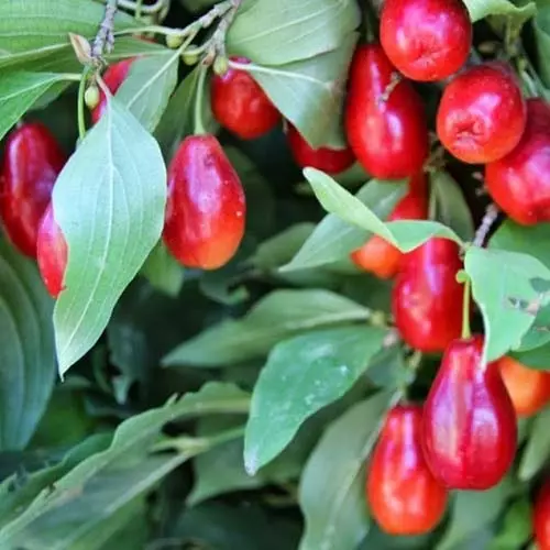 Плоди кизилу великі, темно-червоні, грушоподібної форми.