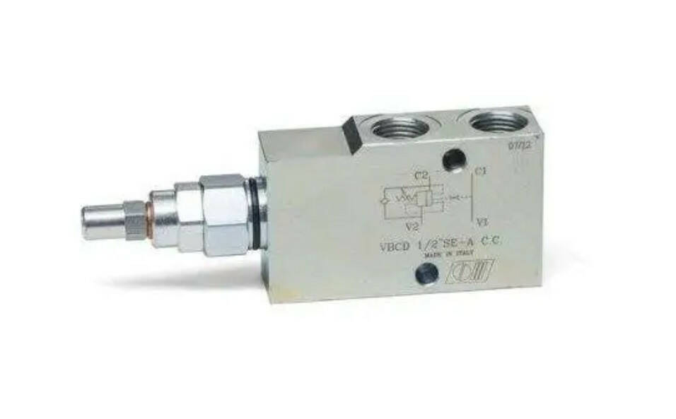 Гальмівний клапан VBCD 3/8 SE/A CC від італійської компанії Oleodinamica Marchesini використовується для керування рухом і фіксацією приводу в одному напрямку, завдяки контрольованому спуску вантажу. Клапан не допускає кавітації гідроприводу. Він не чутливий до зворотного тиску.