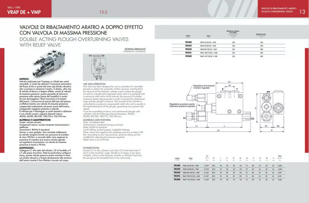 Клапан переворота плуга Oleodinamica Marchesini VRAP використовується на циліндрах зворотного плуга для автоматичного перемикання циліндра на реверс у верхній мертвій точці переміщення рами плуга. Клапан забезпечений подвійним гідрозамком, що гарантує безпеку та можливість фіксації плуга в будь-якій точці. VMP — запобіжний клапан.