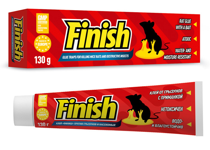 «Фініш» - невисихаючий клей з миттєвим та тривалим ефектом, містить харчові добавки для залучення шкідників, нетоксичний, вологостійкий та водостійкий. Клей Фініш наносять на картон, папір або інший матеріал. Рекомендується наносити засіб на поверхню розміром мінімум 20х20 см. Зроблену таким чином пастку кладуть у місцях, де найчастіше з'являються миші, щури, комахи. Клей також можна використовувати для захисту фруктових дерев від комах, що повзають, шляхом його нанесення на ствол круговою смужкою шириною 15 см. У разі випадкового потрапляння на руки, одяг, різні поверхні клей легко змивається технічним бензином.