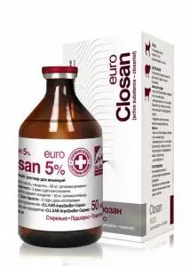 Клозан 5% Опис Прозорий густий розчин жовтого кольору. Склад 1 мл препарату містить: клозантел 50 мг; Фармакологічні властивості ATCvet QP52A, протитрематодні, протинематодні і протицестодні ветеринарні препарати (QP52AG09, клозантел). Діюча речовина препарату - клозантел, протипаразитарний засіб, структурно похідний саліциланілідів, що має довготривалу дію на ендо- та ектопаразитів. Клозантел блокує процес фосфорилювання (утворення АТФ) в організмі паразитів через втручання у процеси транспортування електронів, змінюючи енергетичний метаболізм, що призводить до загибелі паразитів. Клозантел має широкий діапазон дії, ефективний у лікуванні паразитарних захворювань великої та дрібної рогатої худоби , викликаних нематодами, трематодами та членистоногими. Клозантел швидко всмоктується при пероральному або внутрішньом'язовому введенні. Максимальна концентрація його у крові овець досягається через 8-24 години після введення, у крові великої рогатої худоби - через 24-48 годин. Період напіввиведення становить приблизно 12-15 діб. Найбільше клозантал концентрується у легенях і нирках, а основним шляхом його метаболізму є відновлювальна деіонізація. Застосування Профілактика та лікування у великої та дрібної рогатої худоби наступних захворювань: велика рогата худоба: - фасціольоз (Fasciola hepatica, статевозрілі та пізні личинкові форми); - нематодози (дорослі та личинкові форми Bunostomum spp., Haemonchus сontortus, Haemonchus placei та Oesophagostomum radiatum); - гіподермози, спричинені личинками підшкірного овода Hypoderma spp.; вівці,кози: - фасціольоз (Fasciola hepatica, статевозрілі та пізні личинкові форми); - нематодози (дорослі та личинкові форми Bunostomum spp., Haemonchus сontortus, Haemonchus placei та Oesophagostomum radiatum, Chabertia ovina); - естроз (Oestrosis ovis). Дозування Препарат вводиться підшкірно одноразово у наступних дозах: 0,5 мл /10кг м.т., при фасціольозі 1 мл /10 кг м.т. Рекомендується при введенні препарату дозу розділити навпіл і ввести у різні місця. Протипоказання Не застосовувати одночасно з протипаразитарними хлорорганічними препаратами. Забороняється застосовувати дійним коровам та вагітним самкам у останній триместр вагітності. Застереження Забій тварин на м'ясо дозволяється через 28 діб, використання молока для харчування людей - через 14 діб після застосування препарату. На місці введення препарату можливе незначне запалення, яке зникає самостійно через дві - три доби після введення. Деякі породи великої рогатої худоби (шароле та її гібриди) є особливо чутливими до препарату, приблизно у 2 % тварин після введення препарату спостерігалися анафілактичні реакції. Форма випуску Флакони склянні по 10, 50, 100 та 250 мл. Зберігання Зберігати у сухому прохолодному, захищеному від світла місці за температури від 5 до 25°С. Термін придатності - 2 роки з дати виготовлення. Аналог Клозантел, Бронтел, Роленол