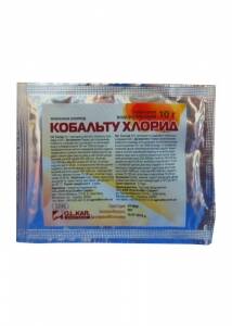 Кобальту хлорид (порошок водорозчинний) Опис Препарат за зовнішнім виглядом являє собою порошок від білого до світло-рожевого кольору Склад 10 г препарату містить: кобальту хлорид 0,05 г; Фармакологічні властивості Кобальт бере участь у кровотворенні, синтезі нуклеїнових кислот, м'язових білків, підтримує тканинне дихання, сприяє засвоєнню вітамінів А, Е, С, В12. Він входить до складу ферментативних систем, що регулюють білковий, вуглеводний і мінеральний обмін. Кобальт стимулює вироблення еритропоетинів, що визначають диференціювання стовбурових клітин кісткового мозку в еритробласти, а також підсилює іонізацію заліза, прискорюючи дозрівання еритроїдних клітин і утворення повноцінних еритроцитів добре наповнених гемоглобіном. Застосування Призначають з профілактичною та лікувальною метою при гіпокобальтозі, що супроводжується порушенням обміну речовин, анемією, спотворенням і втратою апетиту, прогресуючим виснаженням і зміною шкірного покриву, а також для поліпшення ферментативних процесів в передшлунках жуйних. Дозування Перед застосуванням кобальту хлориду його розводять в кип'яченій воді в співвідношенні 10г на 1000 мл води. З профілактичною метою отриманий розчин задають тваринам в осінньо-весняний період протягом двох тижнів один раз на добу в наступних дозах: великій рогатій худобі 250-400 мл, телятам 100-200 мл, вівцям і козам 25-50 мл, ягнятам і поросятам 5 -12 мл. З лікувальною метою розчин задають протягом місяця в наступних дозах: великій рогатій худобі 500-1000 мл, телятам 200-500 мл, вівцям і козам 75-125 мл, ягнятам і поросятам 10-25 мл. Для бджіл 10 г на 2000 мл цукрового сиропа. Весною на одну сім’ю використовують 3 - 4 літра такого сиропу, а осінню 1 - 2 літра Протипоказання Підвищена індивідуальна чутливість до компонентів препарату. Застереження Продукцію від тварин, яким застосовували препарат, використовують без обмежень. Форма випуску Металізовані чи поліетиленові упаковки по 10г. Зберігання Сухе, темне, недоступне для дітей та тварин місце при температурі від 0 °C до 30 °C. Термін придатності - 2 роки.