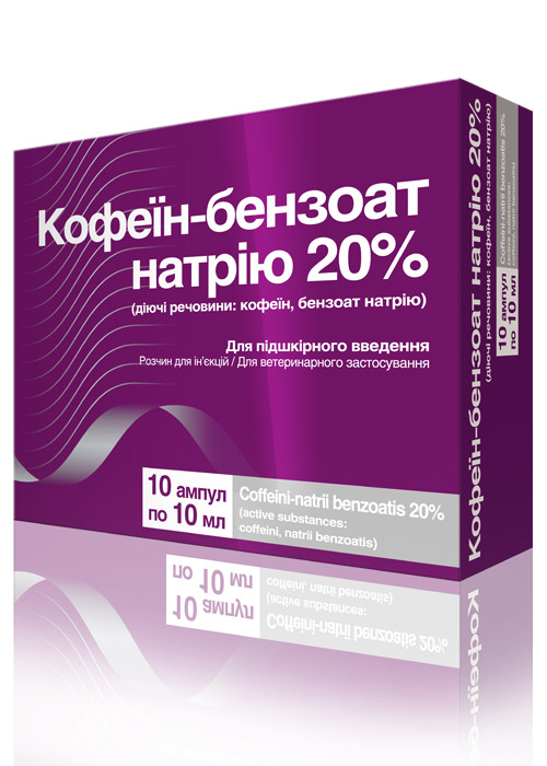 Кофеїн-бензоат натрію 20%-вий розчин для инъекций застосовують для збудження центральної нервової системи при отруєнні отрутами (наркотики, снодійні речовини), перевтомі, м язовій слабкості при різних захворюваннях.
