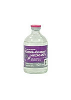 Кофеїн-бензоат натрію 20%-вий розчин для ін'єкцій застосовують для збудження центральної нервової системи при отруєнні отрутами (наркотики, снодійні речовини), перевтомі, м'язовій слабкості при різних захворюваннях.