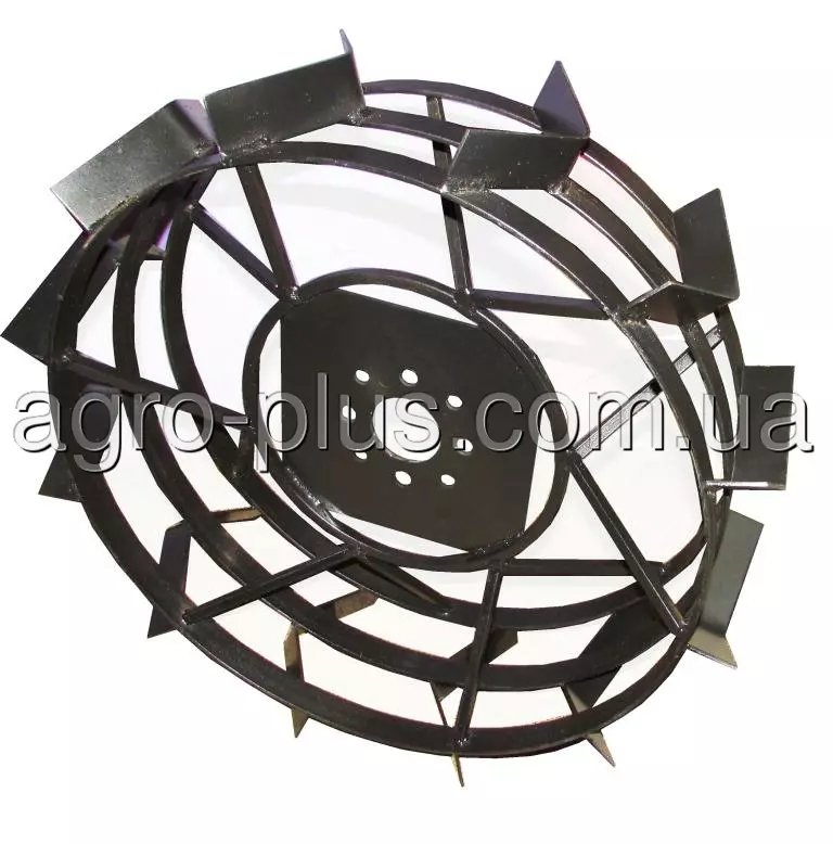 Обід колеса виготовлений із сталевої полоси 4 × 30 мм. Він складається з трьох кілець діаметром 600 мм. Висота шипа грунтозачепа становить 40 мм. Центральна пластина колеса-грунтозачепа виготовлена ??з листової сталі розміром 220 × 220 мм та має товщину 4 мм. Пластина вмонтована у внутрішній обід, який виготовлений зі сталевого квадрата 10 × 10 × 845 мм. Внутрішній і зовнішній обід з'єднуються між собою спицями 10 × 10 × 150 мм. На одному колесі їх встановлено 12 шт. Пластина має центральний отвір