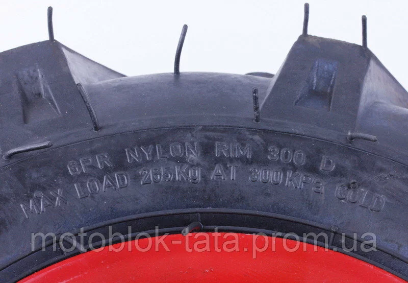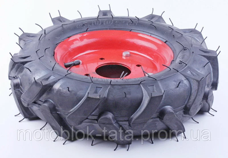 Колесо в сборе 4.00*8 (под 4 болта). Данное колесо предназначено для культиваторов и мотоблоков 6-7 л.с. Рисунок протектора - "елочка", имеет по 11 ламелей на каждой стороне покрышки.