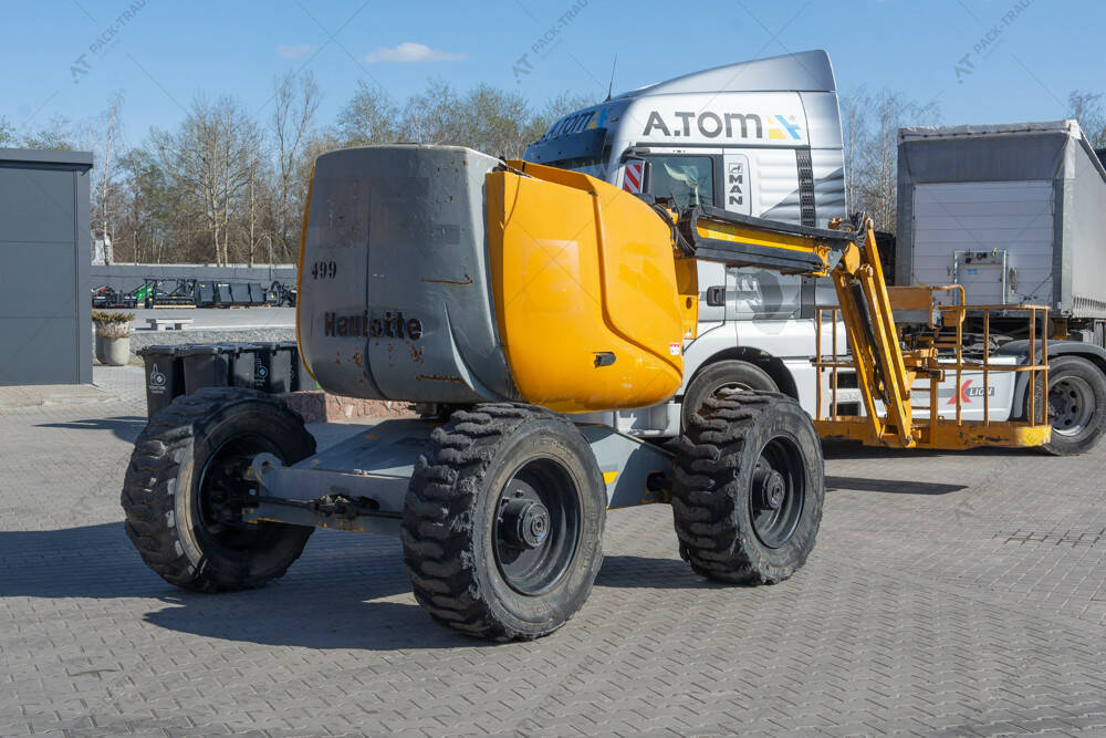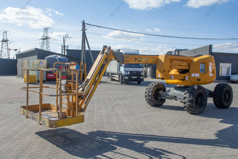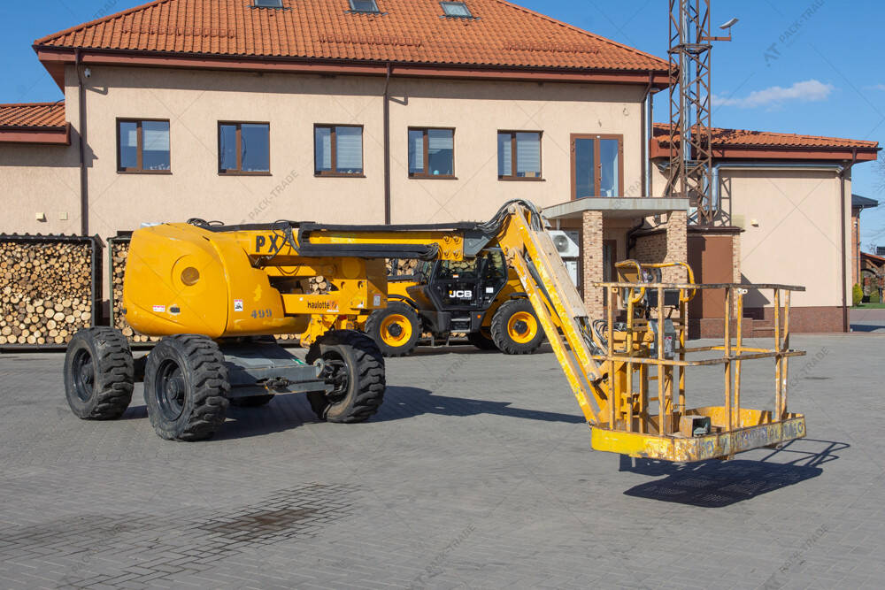 Колінчастий підіймач б/в Haulotte HA18PX, 2005 р/в. Напрацюваня – 6065 м/год. Двигун — 28 кВт. Загальна висота — 2,2 м. Висота підйому — 18 м. Вантажопідйомність — 230 кг. Вага — 8200 кг. Розмір гусениці: 385/65-22,5.