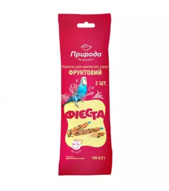 Ласощі Фієста. Колосок «Фруктовий» для хвилястих папуг. Рецептура колоска розроблена спеціально для декоративних птахів, які утримуються в домашніх умовах. Колосок містить всі необхідні компоненти, які забезпечують улюбленців вітамінами, мінералами та іншими корисними речовинами. Сушені яблука та горобина доповнюють меню вітамінами, кислотами, пектинами та мікроелементами. Завдяки герметичній упаковці корм зберігає приємний аромат і захищений від шкідливої дії вологи.
