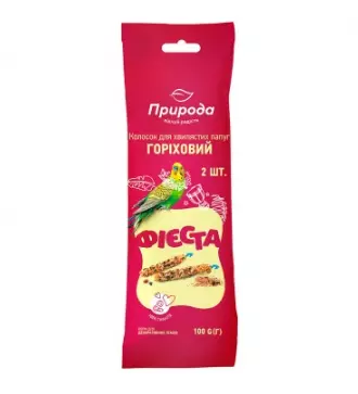 Ласощі Фієста. Колосок «Горіховий» для хвилястих папуг. Рецептура колоска розроблена спеціально для декоративних птахів, які утримуються в домашніх умовах. Колосок містить всі необхідні компоненти, які забезпечують улюбленців вітамінами, мінералами та іншими корисними речовинами. Горіхи збагачують щоденне меню вітамінами В та Е, білками, рослинними жирами, калієм та кальцієм, необхідними для гарного самопочуття, яскравого оперення, зміцнення кісток та шкарлупи яєць. Завдяки герметичній упаковці корм зберігає приємний аромат і захищений від шкідливої дії вологи.