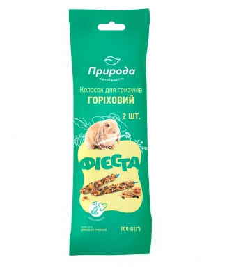 Ласощі Фієста. Колосок «Горіховий» для гризунів. Рецептура колоска розроблена спеціально для декоративних гризунів, які утримуються в домашніх умовах. Колосок містить всі необхідні компоненти, які забезпечують улюбленців вітамінами, мінералами та іншими корисними речовинами. Горіхи збагачують щоденне меню вітамінами В та Е, білками, рослинними жирами, необхідними для гарного стану шерсті. Завдяки герметичній упаковці корм зберігає приємний аромат і захищений від шкідливої дії вологи.