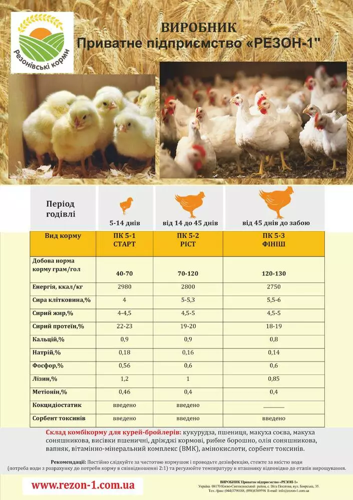 Склад: зернові, макуха соняшникова, макуха соєва, дріжджі, рибне борошно, крейда кормова, аминокислоти, антиоксидант, кокцидіостатик, сорбент токсинів, вітамінно-мінеральна суміш.