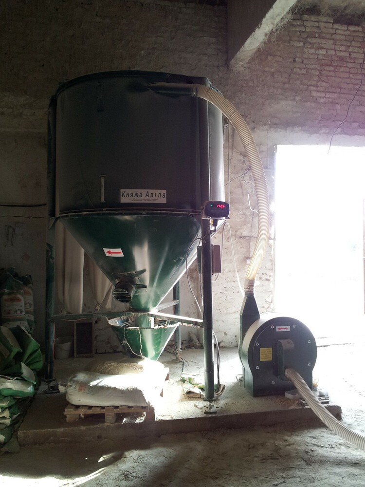 Компактная мельница-смеситель МС-003-ПП с герметично защищённой переработкой различных видов зерновых культур на комбинированные кормовые смеси. Производительность данного агрегата 2,2 т/час, мощность привода дробилки 22кВт*3000об/мин, а смесителя – 5,5кВт*1500об/мин. Данная установка используется с пневматической подачей. Также ООО"Княжа Авила» производит мельницы-смесители с пневматической подачей производительностью 1,5т/час, 2,2т/час и 3,0т/час.