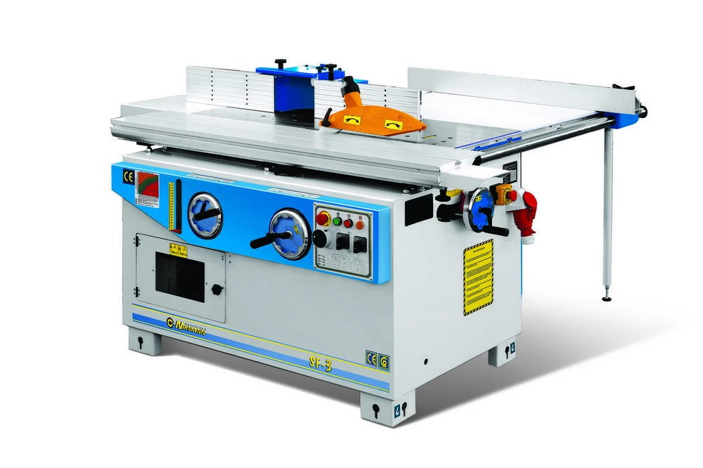 Форматный алюминиевый стол со закаленные стальные направляющие. Телескопическая линейка 1400 мм с двух поворачивающихся упоров. Линейка для параллельная резка с микрометрическая настройка. Наклонения диска до 45° со считывания по шкалу. Диаметр отверстия в столу ø190 mm с аспирационная патрубка под рабочего стола. Фрезерный шпиндель не наклоняющийся. Предохранитель для фрезы с диаметром ø180 mm. Ширина пропила с параллельной линейкой 850 mm.