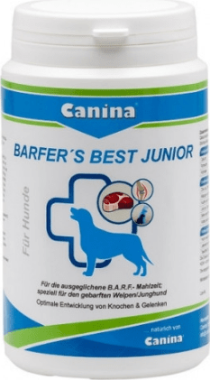Canina Barfer's Best Junior містить весь комплекс вітамінів, мінеральних речовин для покриття добової потреби в них з урахуванням організму щеняти. Легко засвоюється, до смаку подобається вихованцям. Підтримує скелет, зміцнює м'язи та зуби. Підходить для алергічних щенят, тому що не містить тваринних білків, риб'ячого жиру, злаків.