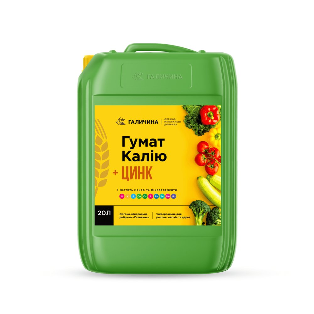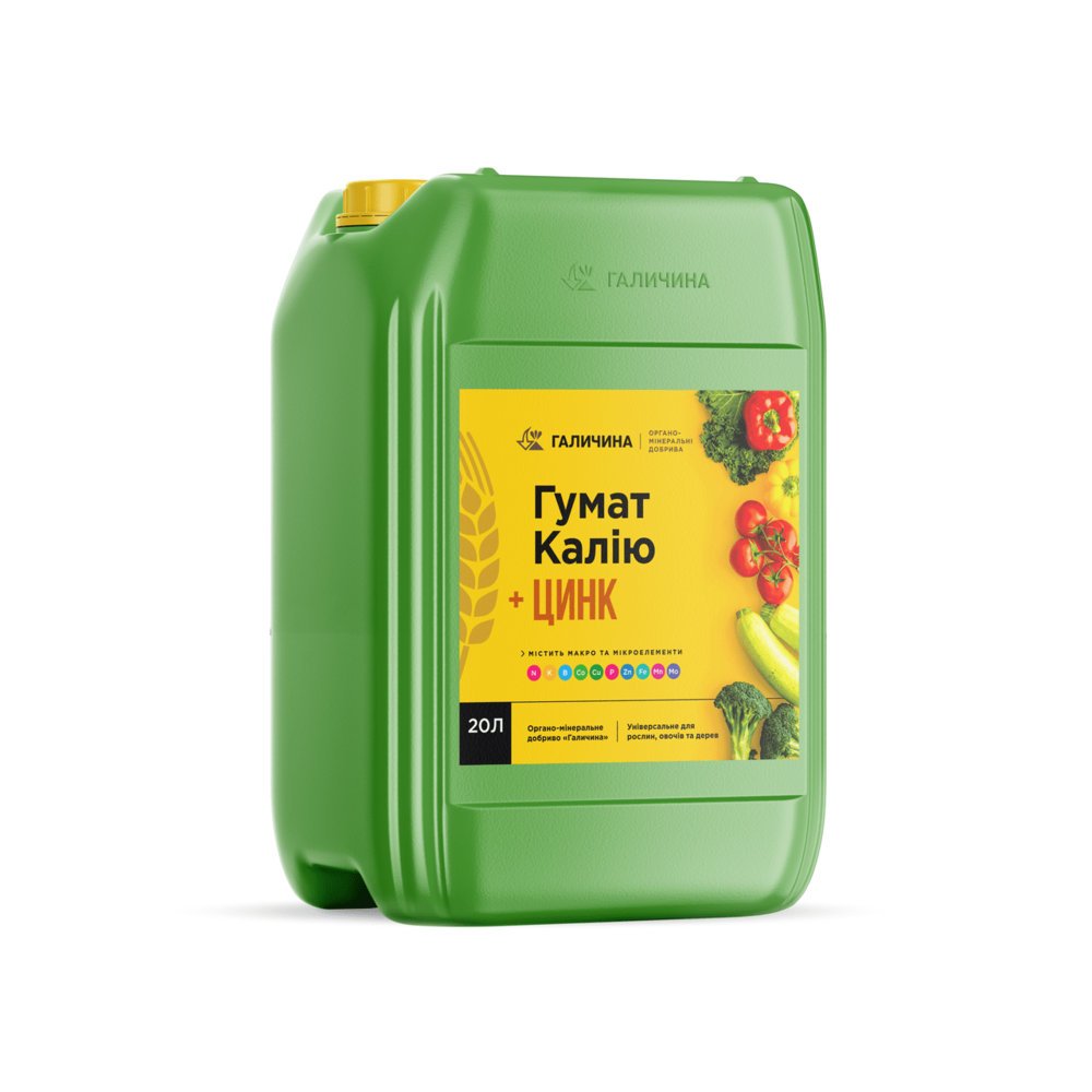 Органо-мінеральне Добриво Гумат Калію +ЦИНК. Збагачений азотом, фосфором, калієм та цинком. ТМ Галичина, 20 л.