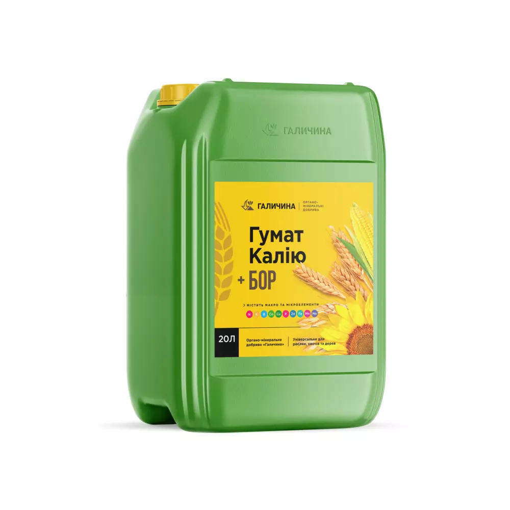 Органо-мінеральне Добриво Гумат Калію +БОР. Збагачений азотом, фосфором, калієм та бором. ТМ Галичина, 20 л.