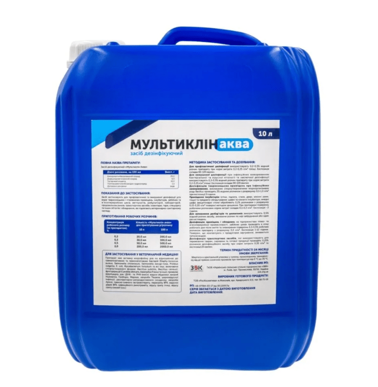 Комплексний миючо-дезінфікуючий засіб Мультиклін Аква - препарат має бактерицидну, фунгіцидну і віруцидну дію, використовується для ручної та машинної мийки, заповнення дезбар’єрів та дезкилимків, дезінфекції транспорту та приміщень, санації приміщень у присутності тварин. Зберігає свою активність при інтенсивному світлі, при використанні жорсткої води, в присутності органічних матеріалів (залишки корму, тваринні виділення та ін.).