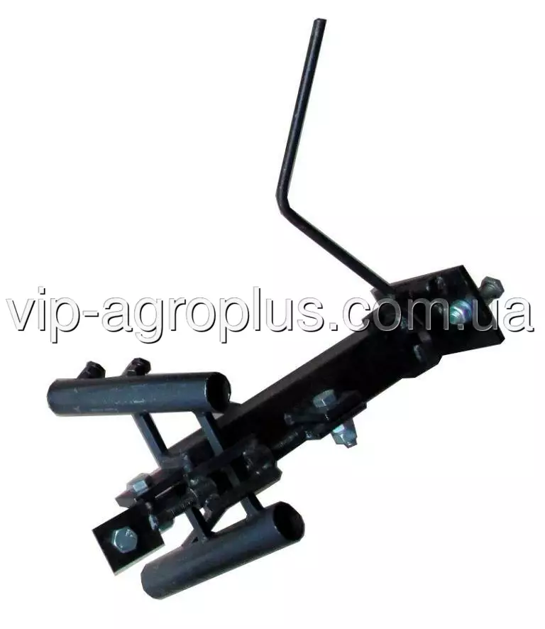 Рама изготовлена из профильной трубы 50 х 50 х 2 х 260. Имеется ручка-фиксатор поворотного механизма с пружиной. Вращение происходит на 180о перпендикулярно к плоскости движения мотоблока.