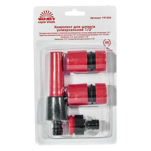 Комплект для шланга універсальний 1/2" Vitals - це ідеальне рішення для збирання поливальної лінії та зручного підключення її до водопровідної труби або крану з зовнішнім різьбленням діаметром 1/2" або 3/4".