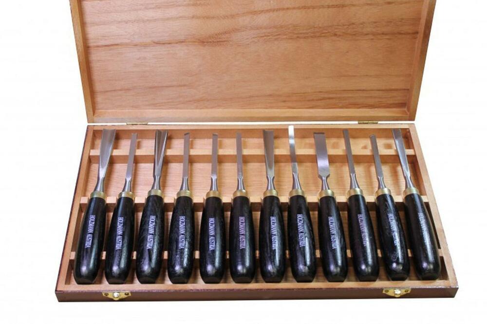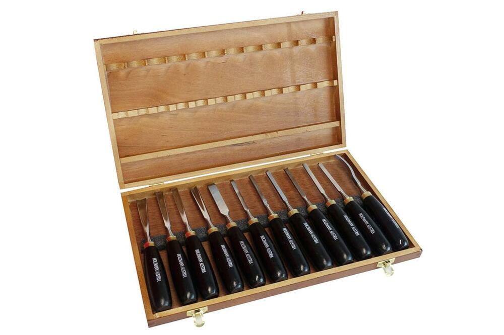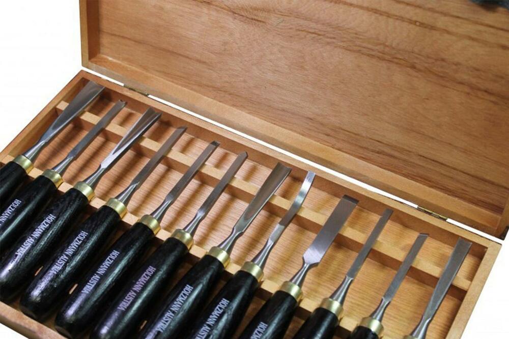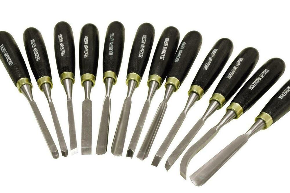 например, плоский резец шириной 12 и 6 мм, пустотелое долото шириной 16, 12 и 10 мм, V-образный резец шириной 16 мм, ширина остальных резцов составляет около 6 мм.;