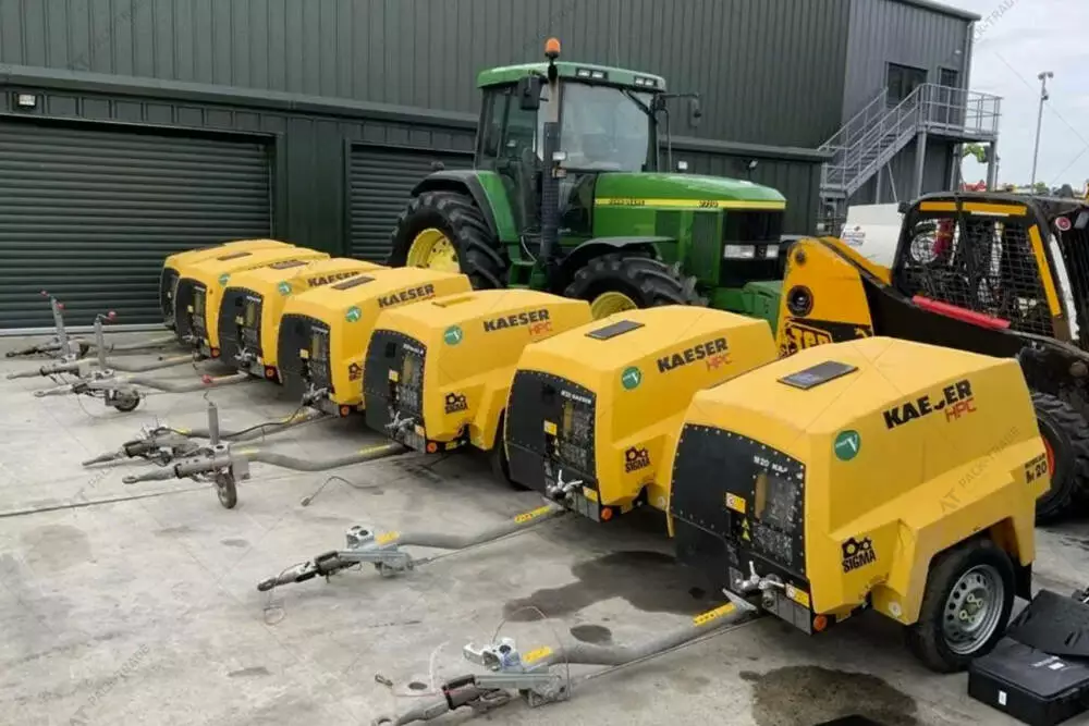 Компресор б/в Kaeser M20PE, 2022 р/в, з напрацюванням 159 м/год. Потужність двигуна – 14,7 кВт. Двигун – Kubota D722 . Габаритна Ширина – 1,2 м. Висота – 1,2 м. Довжина – 3,0 м. Шини: 145/80 R13. Робочий тиск – 7 Bar. Подача повітря – 2 м3/хв. Підключення повітря – 2х G3/4.
