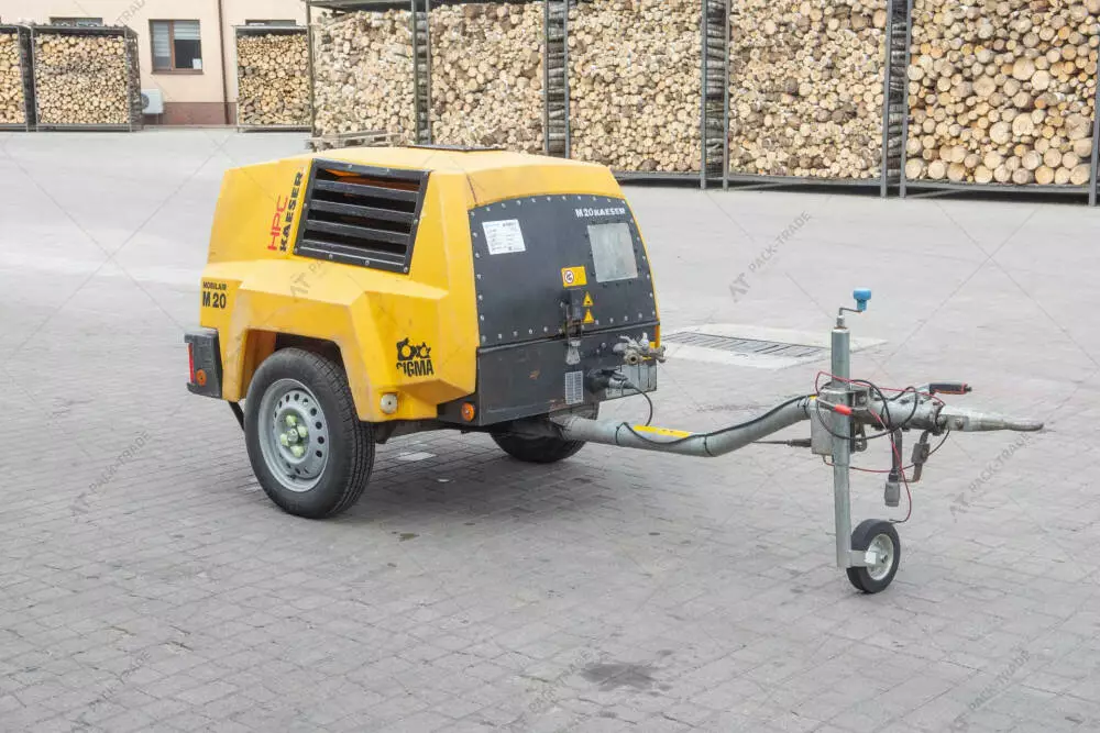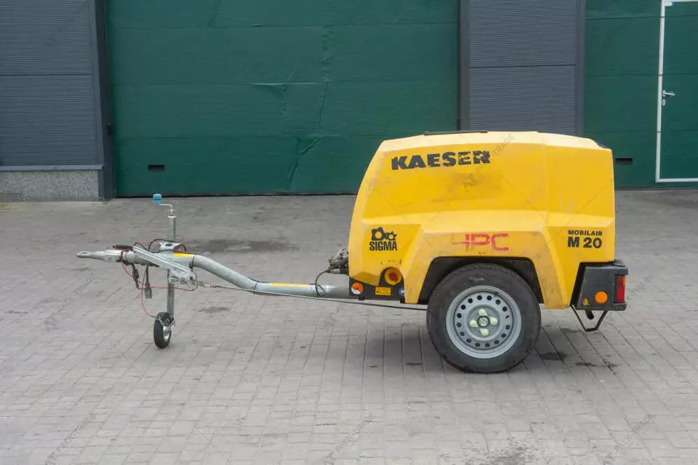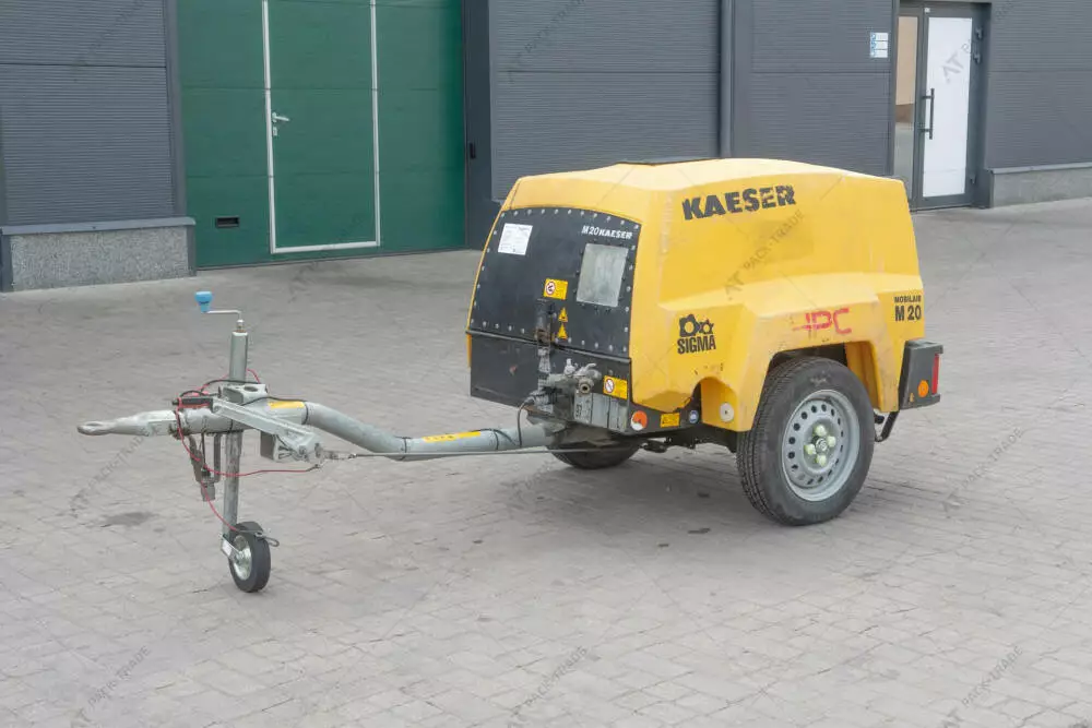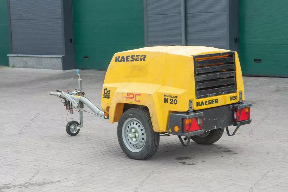 Компресор б/в Kaeser M20PE, 2018 р/в, з напрацюванням 364 м/год. Потужність двигуна – 14 кВт. Двигун – Kubota D722. Габаритна Ширина – 1,2 м. Висота – 1,2 м. Довжина – 3,0 м. Шини: 145/80 R 13. Робочий тиск – 7 Bar. Подача повітря – 2 м3/хв. Підключення повітря – 2х G3/4.