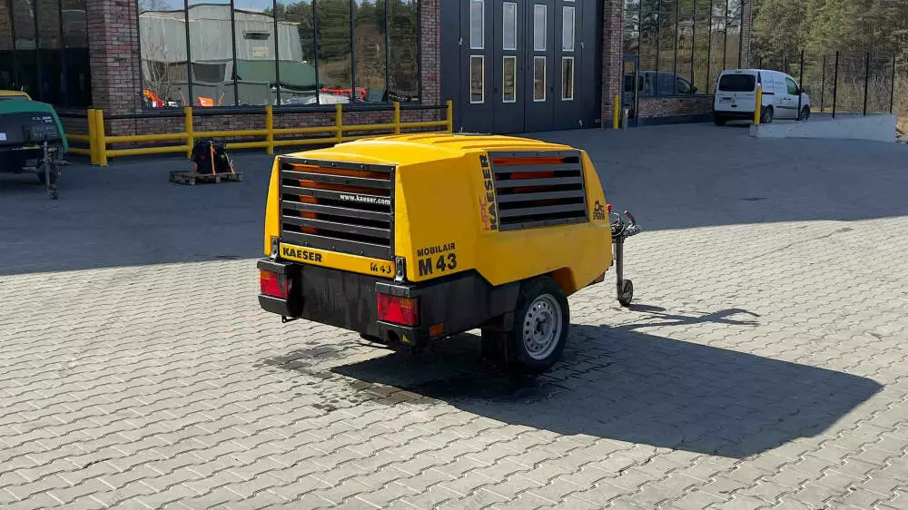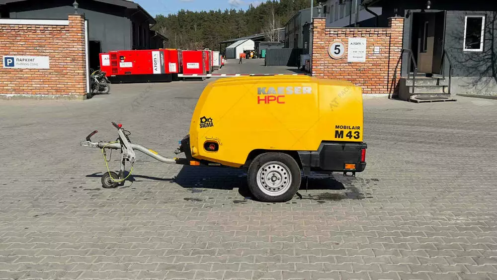 Компресор б/в Kaeser M43PE, 2018 р/в, з напрацюванням 540 м/год. Габаритна висота 1,35 м. Шини 145/80R13. Робочий тиск 7 Bar.