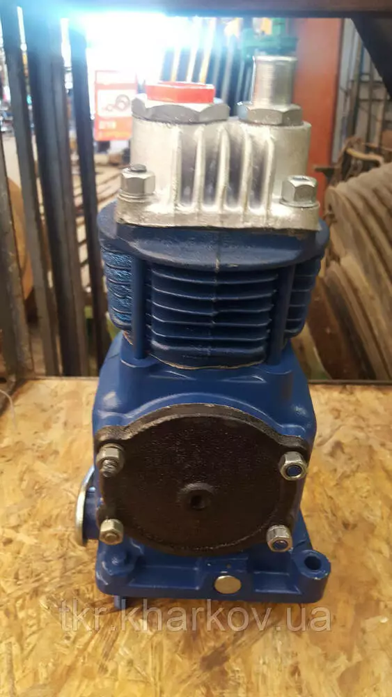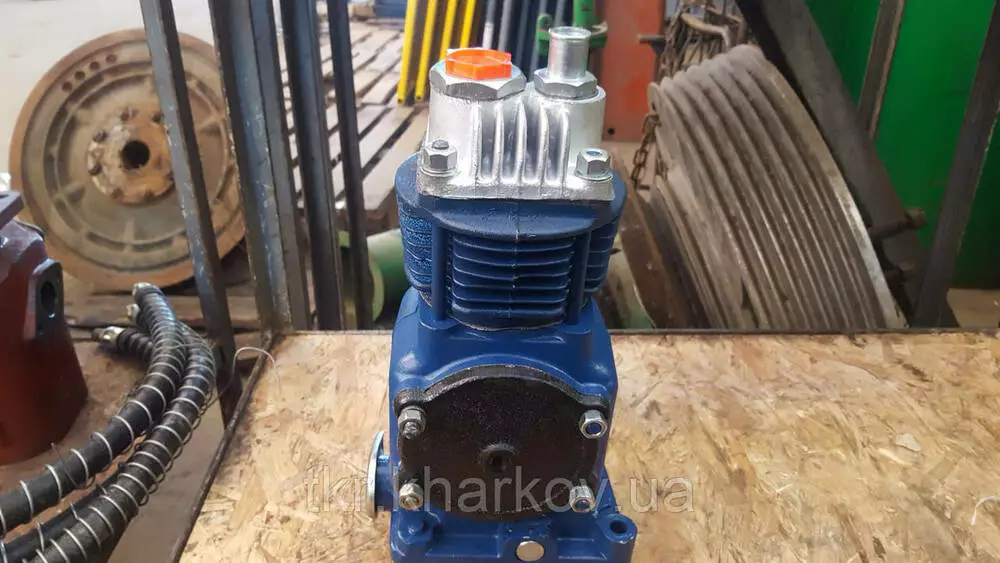 Цей компресор МТЗ (А29.01.000) є одноциліндровим, поршневого типу, одноступеневим. Встановлюється ліворуч на кришці розподілу двигунів Д-240, Д-243, Д-245. Компресор приводиться в дію від шестерні паливного насоса за допомогою проміжної шестерні (на малюнку поз. 1) на шестерню ведому, який змонтований на колінчастому валу (поз. 3) компресора. У верхній частині (повості) компресора А29.01.000 містяться всмоктувальний (поз. 11) і нагнітальний (поз. 12) клапани пластинчастого типу, притиснуті до сідниць пружин. Система охолодження компресора — повітряного типу, система мастила — змішаного. Олива з оливної магістралі двигуна надходить по трубці до кришки компресора, а потім через отвір, виготовлений в ущільнювальному пристрої, надходить у канал колінчастого вала. Через цей же канал олива підводиться до підшипника шатуна й одночасно за трубкою йде до підшипника шестерні проміжної. Інші поверхні тертя змащуються розбризкуванням. Зливання оливи з компресора здійснюється в піддон двигуна через кришку розподілу. Робочий цикл компресора МТЗ відбувається в такий спосіб. Під час робочого двигуна отримує привод колінчастий вал компресора. Рухаючись угору, поршень (поз. 7) стискає повітря, яке через клапан (поз. 12) нагнітальний виштовхується в канал нагнітання, а далі трубопроводами спрямовується в повітряний балон. У момент досягнення максимального тиску в балоні (7,5 кгс/см2) відбувається спрацьовування регулятора тиску, що призводить до розвантаження компресора. Водночас повітря в повітряний балон нагнітатися припиняється. У разі зниження тиску в пневматичній системі до 6,5 кгс/см2 відбувається повторне спрацьовування регулятора тиску та відновлюється надходження нагнітного повітря в пневматичну систему трактора.