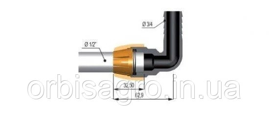 Конектор 90 ° під трубу ½ "з виходом під шланг 19 мм.