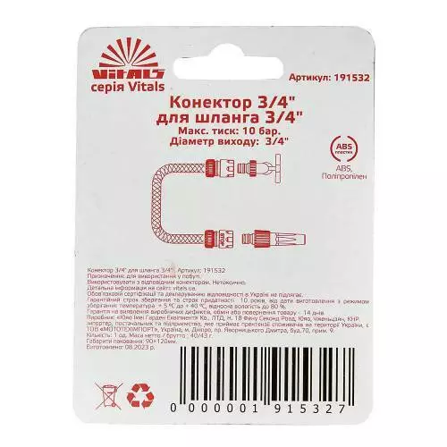 Конектор 3/4" для шлангу 3/4" Vitals - це надійний та зручний інструмент, який застосовується для з'єднання шлангу з насадками зрошувальної системи.