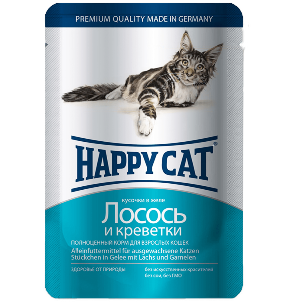 Вологий корм Happy Cat з лососем та креветками - це повноцінний збалансований раціон у вигляді рибних шматочків в апетитному желе для вашої кішки.