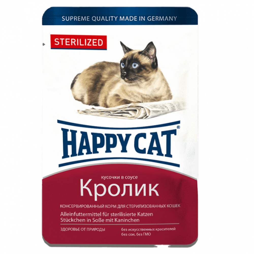 Вологий корм Happy Cat Sterilized з кроликом - це повноцінний збалансований раціон у вигляді м'ясних шматочків в апетитному соусі для вашої кішки.